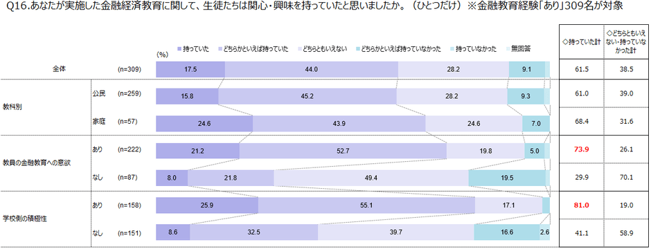 金融教育について重要だと思っている、または意欲的に取り組んでいる教員がそれぞれ全体の7割を超えている一方で、金融教育の実施に対して積極的に取り組んでいる学校は4割弱にとどまっています。また、学校側が金融教育に積極的であるほど、教員は金融教育に意欲的であり、生徒の興味・関心も高いという結果が分かりました。