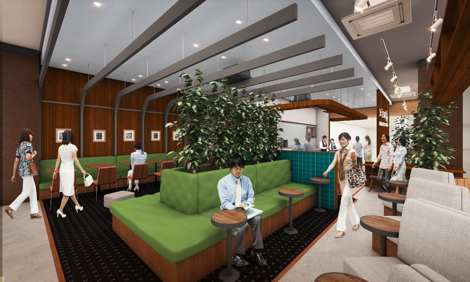 (2)オーセンティックゾーン・・・上島珈琲店のアイデンティティを楽しんでいただけるエリアです。壁面にベンチを設け、多くのお客さまにご利用いただけるように設計しています。