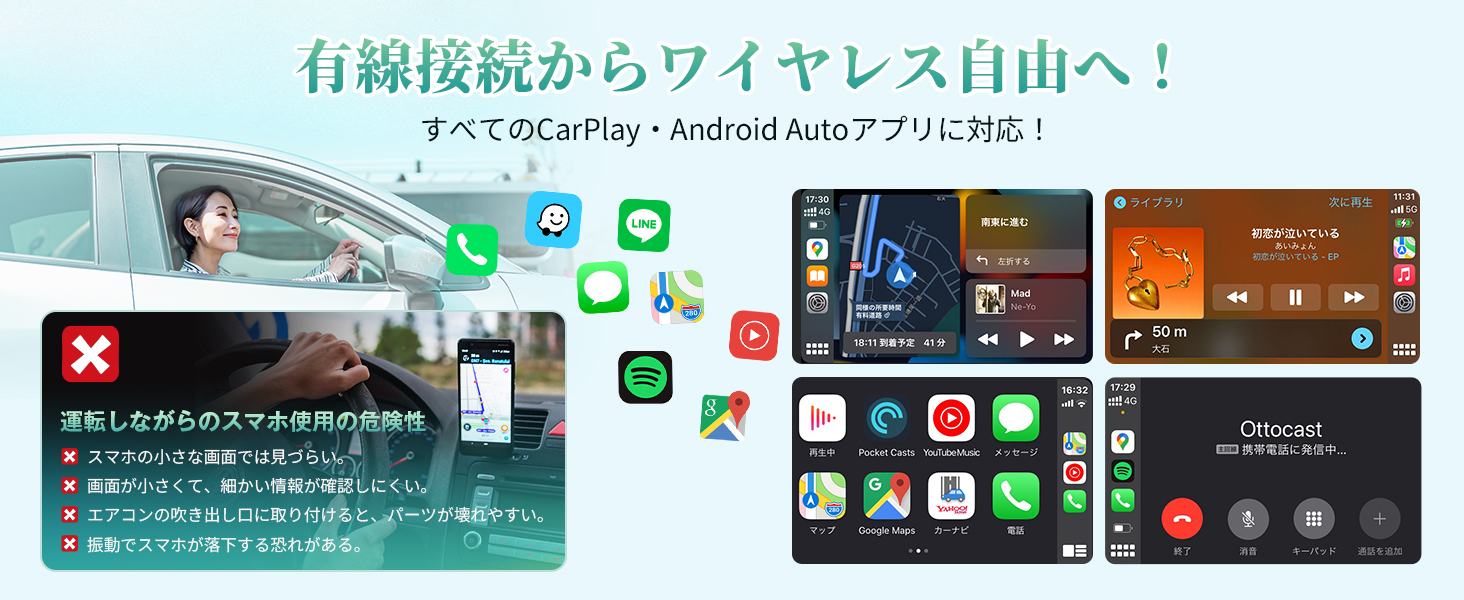 ワイヤレス CarPlay & Android Auto 対応のアプリはすべてお使いいただけます。