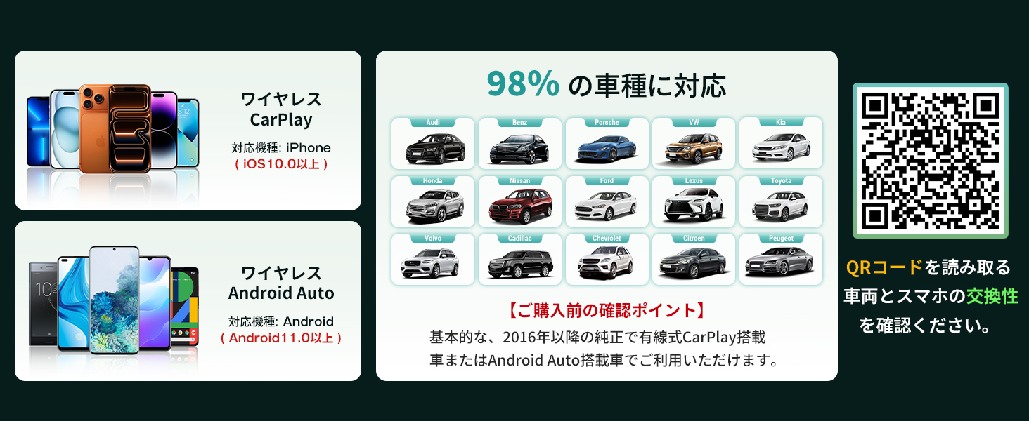 幅広い車種およびスマートフォンに対応し、車内環境をより快適でスマートなものへと進化させます。