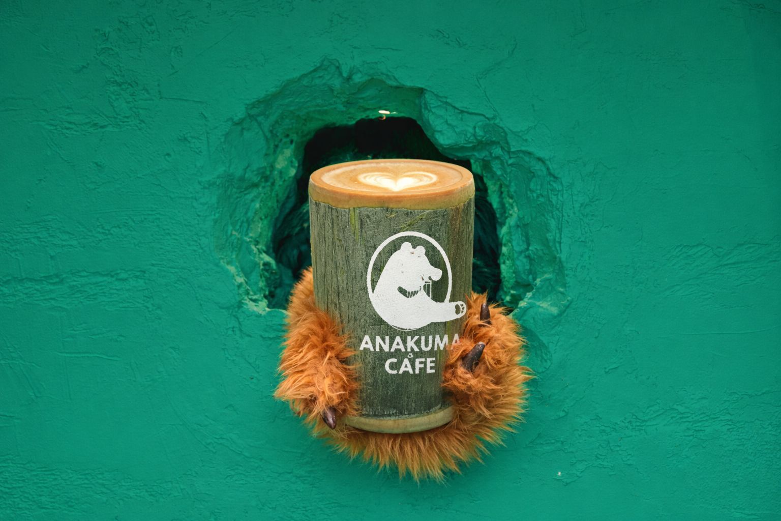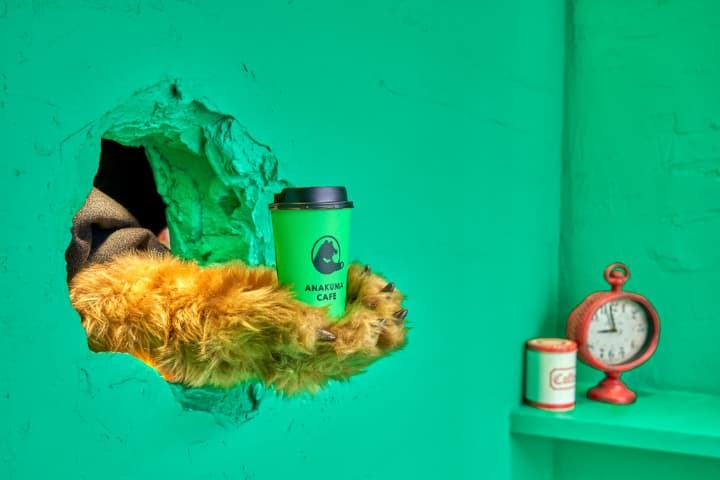 緑色の壁に開いた小さな穴。そこから現れるのは、8頭のクマたちのモフモフの手。来店者は商品を受け取るだけでなく、クマたちの世界に触れる“参加者”になります。