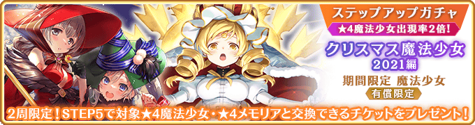 本ガチャより、2021年に登場したクリスマスの★4魔法少女とメモリアが期間限定で登場いたします。