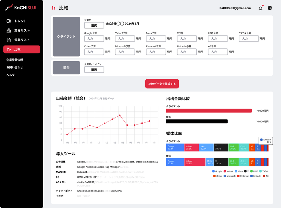 対象の企業名などを入力すると、「広告出稿額の差分」「導入ツールの比較」「競合の、出稿金額の推移/想定媒体のアロケーション比率」といったの情報を取得することができるため、営業資料や戦略の質を高めることができます。