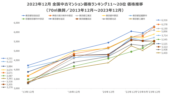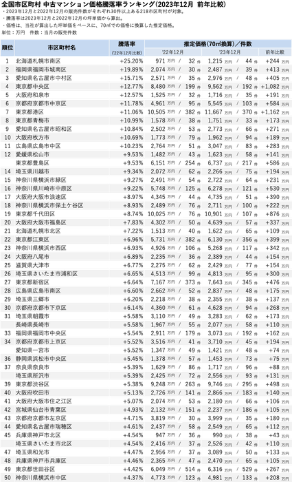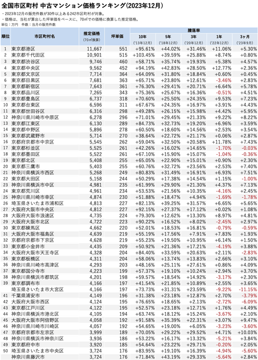 「マンションレビュー」2023年12月 全国市区町村 中古マンション価格/騰落率ランキング100を発表