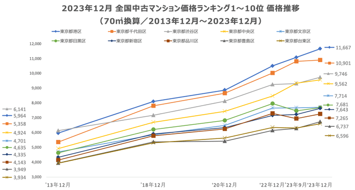 「不動産×WEB×ビッグデータ」の領域で、さまざまな不動産テックサービスを展開する株式会社ワンノブアカインド(本社:東京都港区、代表取締役社長:川島 直也、以下当社)は、当社が運営するマンション情報サイト「マンションレビュー」の保有データを元に、2023年12月の全国市区町村における中古マンションの相場を調査。坪単価をベースに70㎡での価格に換算した「中古マンション価格」*1と価格ランキング上位20件について過去10年間の価格推移、および1年前からの価格の上昇率を表す「騰落率」のランキングを発表いたします。