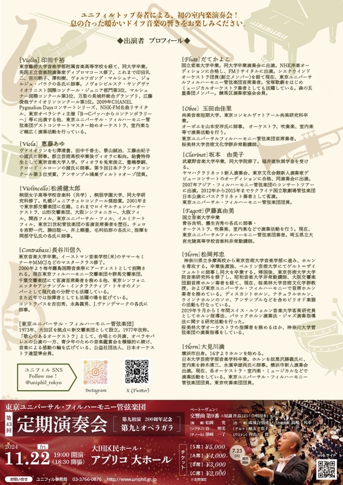 東京ユニバーサル・フィルハーモニー管弦楽団の楽団員による室内楽演奏会。ベートーヴェンの七重奏をメインに、弦楽器と木管楽器のアンサンブルをご堪能頂ける豪華プログラムをお届けします。