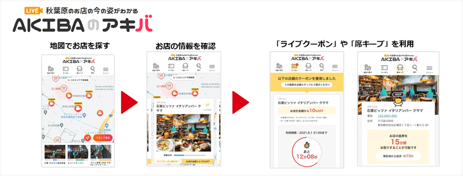 「AKIBAのアキバ」では、株式会社ぐるなび※1が提供する、「OPTiM AI Camera」を使って飲食店の混雑状況をリアルタイムに発信するサービス「飲食店LIVEカメラ」や、凸版印刷株式会社※2が提供する施設の混雑状況を表示するサービス「nomachi(ノマチ)」を活用し、カメラやセンサーによる混雑状況と、ぐるなび台帳などによる予約情報をかけ合わせて、「AKIBAのアキバ」特設サイトなどで飲食店の空席状況などの店内情報をリアルタイムに発信します。さらに、集客に役立てるため空席時のみ発行可能な「ライブクーポン」機能や、予約リクエストを送信し15分間希望人数分の席を押さえることができる「席キープ」機能を搭載いたします。飲食店への送客拡大や、ユーザーが安心安全に外食を楽しむための環境整備に貢献し、飲食店・ユーザー双方に新たな価値を提供します。今後は秋葉原エリアのサイネージなどを活用して認知拡大に努め、2022年1月下旬まで本実証実験を行う予定です。