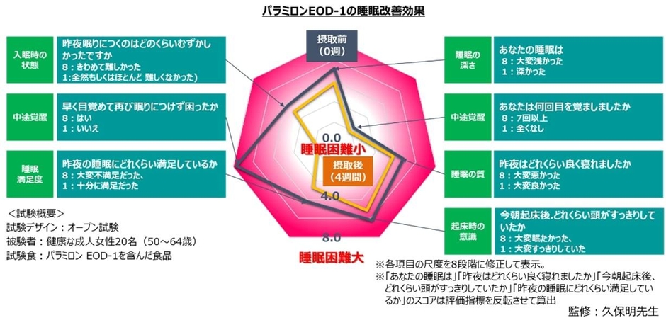 <「パラミロンEOD-1」4週間摂取による不安疲労軽減評価試験> 「パラミロンEOD-1」摂取で、不安疲労軽減効果を確認 睡眠への満足度向上、不安疲労の指標となる意欲・行動が有意に改善