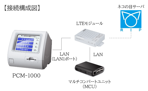 本サービスは富士市役所で使用する受付発券機に対し、インターネット回線と情報配信装置を取り付けることで、受付の状況を「ネコの目.com(R)」で確認できるようになります。