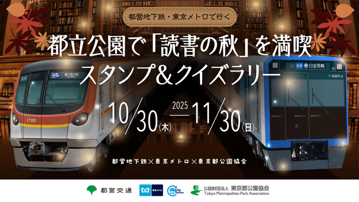 東京都交通局(東京都新宿区、交通局長:堀越 弥栄子)、東京地下鉄株式会社(本社:東京都台東区、代表取締役社長:小坂 彰洋、以下「東京メトロ」)、東京都建設局(東京都新宿区、建設局長:花井 徹夫)、公益財団法人東京都公園協会(本社:東京都新宿区、理事長:矢岡 俊樹、以下「東京都公園協会」)は、都営地下鉄×東京メトロ×東京都公園協会「都営地下鉄・東京メトロで行く都立公園で『読書の秋』を満喫スタンプ&クイズラリー」を2025年10月30日(木)から11月30日(日)まで合同で実施します。