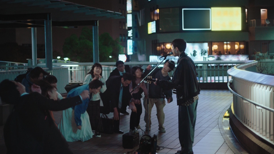 夜の路上で、手にしたギターで演奏を始める男性。ゆったりとしたテンポで美しく奏でられた音楽に、続々と、通りかかった人々が足を止めて彼の演奏に聴き入ります。