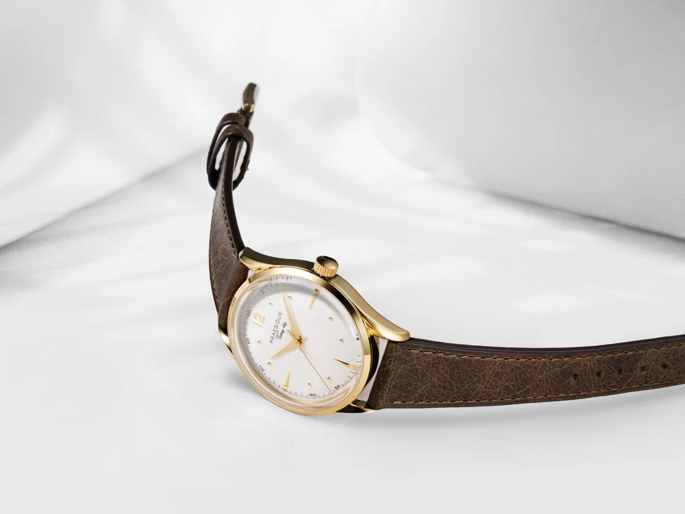 1945年9月2日、戦いの終結とともに訪れたのは、帰還・省察・そして再生の時でした。その歴史的な瞬間から着想を得て誕生した Victory Watch は、戦場の荒々しさを超えて、平和と繁栄の象徴としてのドレスウォッチを体現します。スリムな38mmのケースは、PVDゴールドコーティングを施したステンレススチール製。サファイアクリスタル風防を組み合わせ、普遍的なバランスと繊細なクラフツマンシップを表現しました。剣型の針、ファセット加工されたインデックス、ラッカー仕上げまたはブラッシュ仕上げの文字盤など、伝統的な時計づくりの美学を随所に感じられるデザインです。