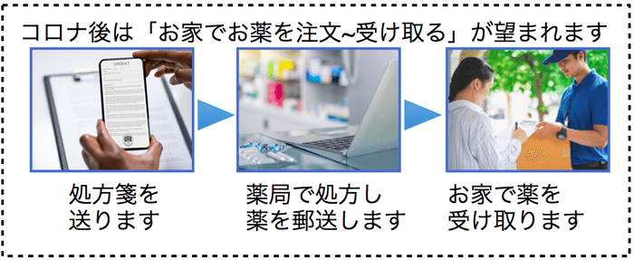 本プロジェクトでは、患者様が処方箋データ送信し、処方箋薬局を経由して、ご自宅にお届けすることを目的としております。当社は処方箋薬局での事務作業をAI-OCRの利用などを通して、コロナ社会に対応し、デジタル化の流れに即した活気ある薬局への転換をお手伝いします。