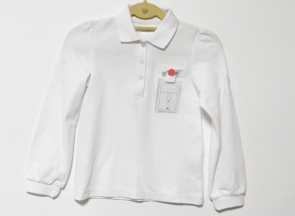 服に縫い付けた小さな布製留め具に、名札の安全ピン部分を留め具のボタンに引っ掛けるだけで使用が可能です。