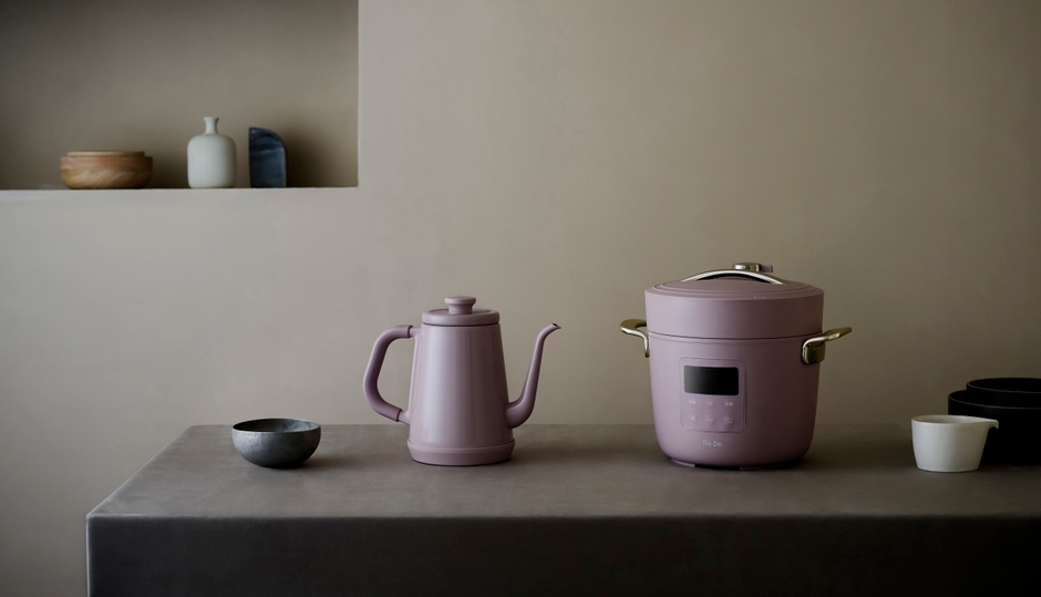 展開する2製品は、マットな質感と上品なサテンゴールドの持ち手が醸し出す、ライフスタイルを彩るデザインの電気圧力鍋「Re・De Pot」と、ホーローを思わせる質感と佇まいの温度調節電気ケトル「Re・De Kettle」。