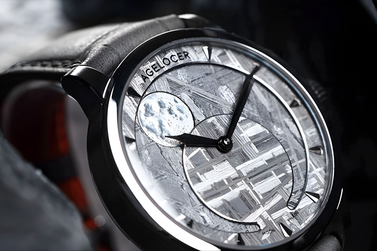 本製品は、隕石特有の模様をそのまま活かした一点物の文字盤と、月の満ち欠けを29.51日周期で再現する高精度ムーンフェイズを搭載。量産では表現できない素材の個性と、機械式時計ならではの立体的な動きを融合させた、時間そのものを楽しむための腕時計です。