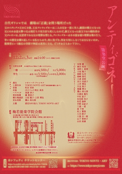 認定NPO法人TOKYO NOVYI・ART(東京都世田谷区)主催、能楽堂『アンティゴネー』公演が2023年12月2日 (土) ~2023年12月3日 (日)に梅若能楽学院会館(東京都中野区東中野2-6-14)にて上演されます。