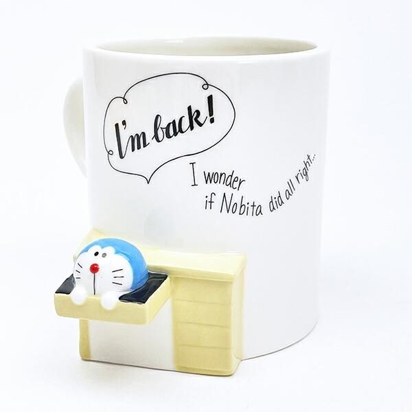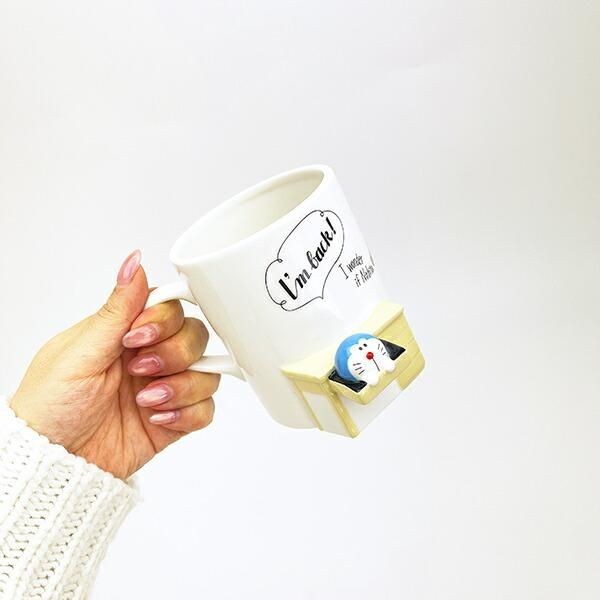 こちらはドラえもんのマグカップ。外観に引き出しに入ったドラえもんが入っている!!一風変わったデザインです。ちょうど未来から帰ってきたところですね。