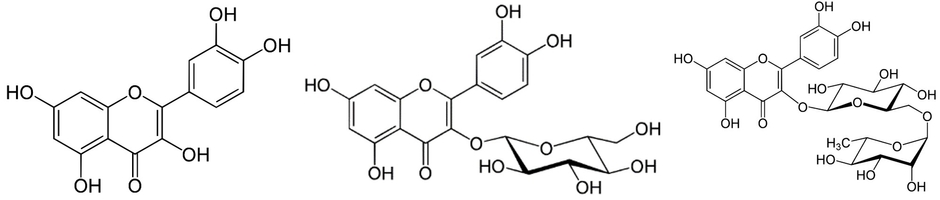 「イソクエルシトリン」は、タマネギ、ブロッコリー、レタス、トマトなどの野菜類、リンゴ、ブドウ、イチゴなどの果物類、緑茶や紅茶などの茶飲料に多く含まれる「ケルセチン配糖体」の一種で、一つのケルセチン分子に一つの「グルコース」(ブドウ糖)分子が結合したものです。また、ソバに含まれる健康成分として有名な「ルチン」もケルセチン配糖体の一種であり、イソクエルシトリンのグルコース部分に、更に「ラムノース」が結合したものです(下図参照)。
