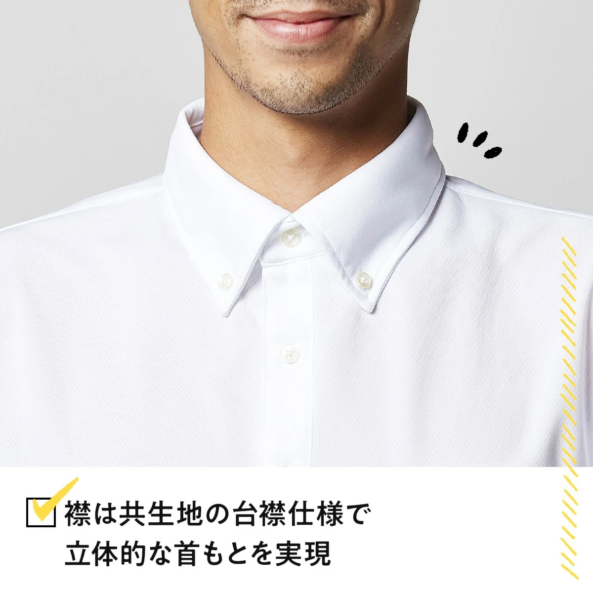 襟は共生地の台襟&ボタンダウン仕様で形崩れしにくく、胸ポケットはユニフォーム用途に合わせた安心のスタンダードサイズです。