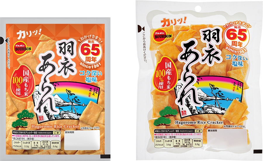 株式会社ブルボン(本社:新潟県柏崎市、代表取締役社長:吉田 匡慶)は、国産もち米を使用した「羽衣あられ」が発売65周年を迎えるにあたり、特別ロゴを付けたパッケージにリニューアルいたします。