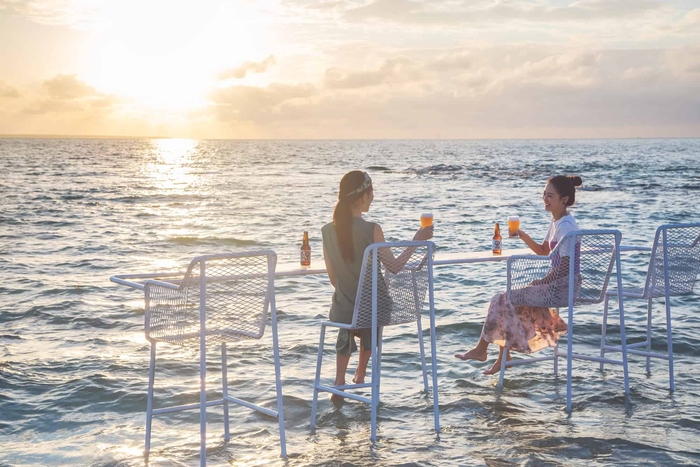 透明度の高い珊瑚礁の海に足先を浸けて、ビールを堪能できる「海上カウンター席」が登場。コバルトブルーの海を眺めながら、波の音に耳を傾け、ビールを片手にゆったりと寛げます。