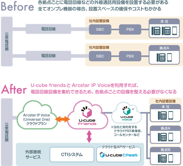 しかし、異なる通信事業者やネットワーク間を相互に接続する「U-cube friends」と「Arcstar IP Voice」の連携により、各拠点や店舗ごとにPBXや電話回線などの外線通話用設備を設置する必要がなく、現在使用中の電話番号(0ABJ番号)をそのまま利用できるクラウドサービスへの移行を実現します。