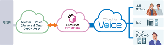 企業などに置かれる電話回線の交換機(PBX)をクラウド化するサービスで、PBX機器をクラウド化することにより、機器の保守管理やオフィスの引越し、レイアウト変更による内線番号変更などにかかるコストを抑えることが期待できます。また「U-cube friends」は以前から「TCloud for Voice」の外線発信サービスの一部としても活用されています。