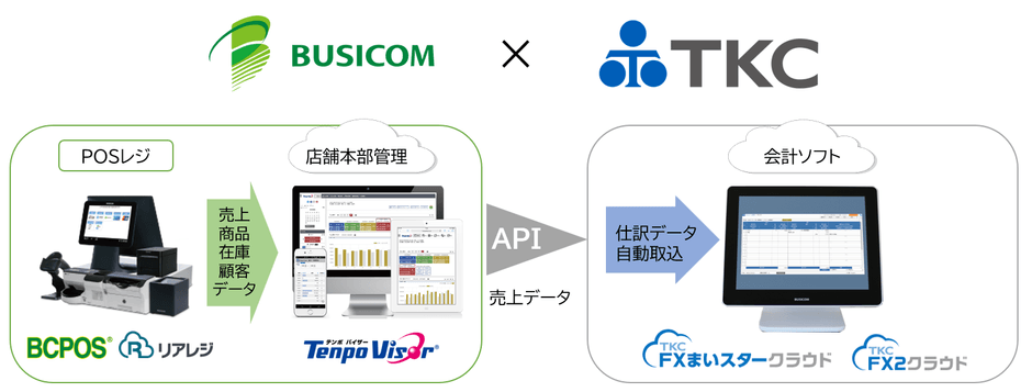 株式会社ビジコム(所在地:東京都文京区、代表取締役:中馬 浩、以下「ビジコム」)は、店舗のPOSデータを集計・分析するクラウド店舗本部管理システム「TenpoVisor」と財務・会計システムおよび経営情報サービスを開発・販売する株式会社TKC(本社:栃木県宇都宮市、代表取締役社長:飯塚 真規、以下「TKC」)の会計ソフト「FX2クラウド」「FXまいスタークラウド」(以下「FXクラウドシリーズ」)をAPI連携させ、2023年2月22日より提供開始します。