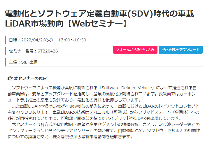 S&T出版社主催で「電動化とソフトウェア定義自動車(SDV)時代の車載LiDAR市場動向【Webセミナー】」と題したセミナーで2022年4月26日に講演することが決まりましたのでご報告申し上げます。