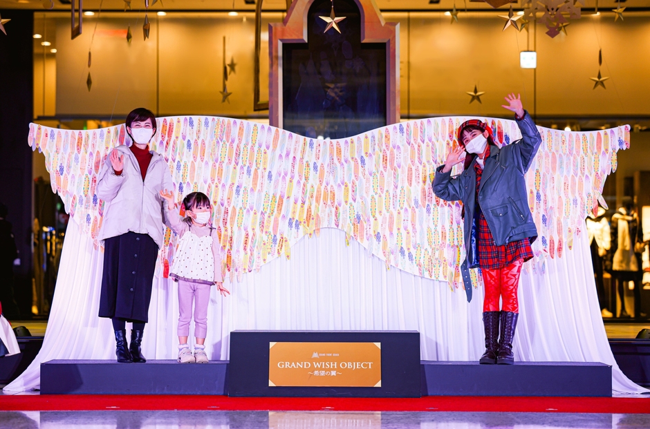 オブジェのお披露目にあたっては、11月10日(木)のクリスマスイベント初日から、大阪文化服装学院の学生たちによってデザインされたメッセージカードを館内に設置。そのカードに来街者の皆様に各々が「WISH(希望・願い)」を記入し、翼型のオブジェに貼り付けていただく参加型企画を実施。カード配布終了後に急きょWEB上で募集したメッセージと併せて、最終1,000通を超えるメッセージが集まりました。イベント内では、メッセージカードのデザインを手がけた大阪文化服装学院・2年生の豊田愛さんと、当日イベントに大阪府淀川区からお越しいただいた浅野さん親子が最後の2枚のカードを飾り付けて、「GRAND WISH OBJECT~希望の翼~」が完成しました。大役を担った豊田さんは「大役を任せていただき人生の良い思い出となりました」、浅野さん親子は「今日遊びに来てこのイベントを知ったのですが、子どもが見てみたいと言ったので参加しました。娘はメイクがしたいとメッセージを書きました。楽しかったです」と感想を述べました。