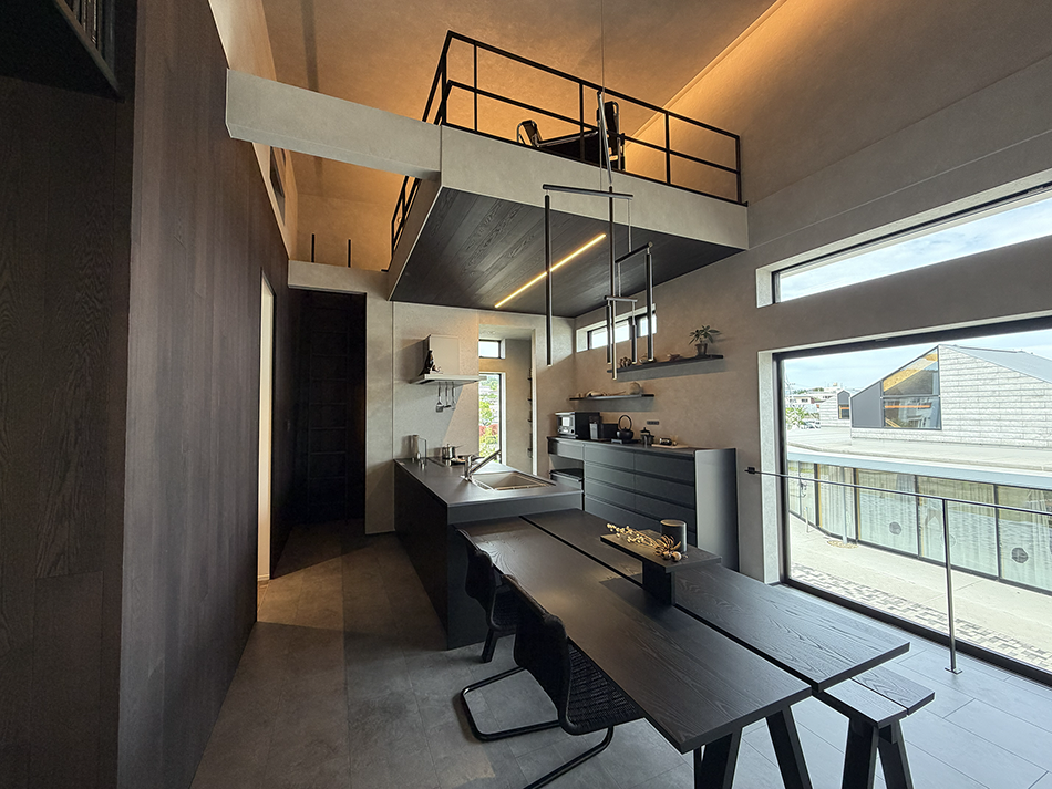 「男の隠れ家」:ダークなインテリアに天然木の壁。ロフトで日本酒を嗜みながら、吹き抜けを見下ろす贅沢なひとときを提案します。