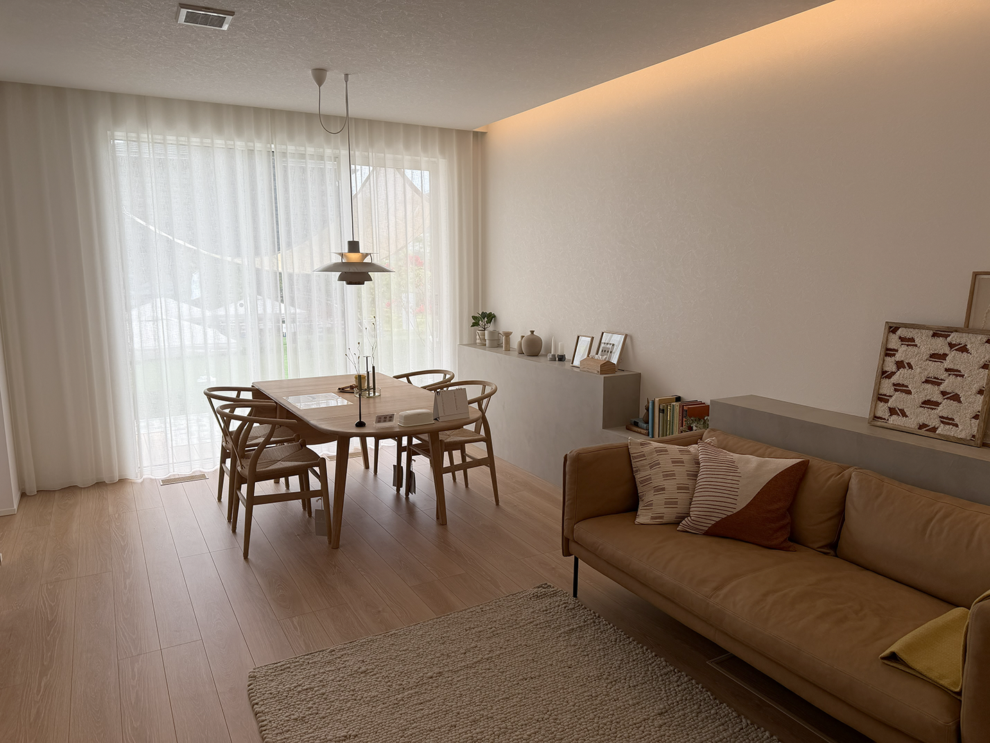 今回のモデルハウスは、雑誌の1ページに飛び込むような感覚と、「家庭用エアコンで家中の空気が変わる」という魔法のような体験が共存する、五感を刺激する空間です。