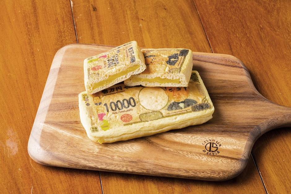 7月に20年ぶりにデザインが改刷される渋沢栄一翁肖像の新壱萬円札を模した日本初の壱萬円札パンです。「お札=おさつ=さつまいも」という連想から、中には自家製のスイートポテト餡がたっぷり詰まっています。本物の壱萬円札と同じサイズに仕上げ、表には渋沢栄一翁の可愛らしいイラスト肖像も。製法としても水を使用しない無水製法でしっとりとした食感に仕上げています。