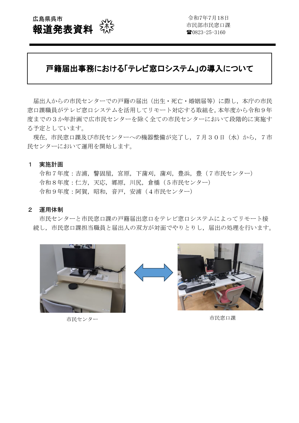 このたび広島県呉市において、戸籍届出事務の効率化と住民サービス向上を目的に、当社のテレビ窓口システムが導入されました。7月30日より市内7つの市民センターで運用が開始され、順次全センターへと拡大される予定です。