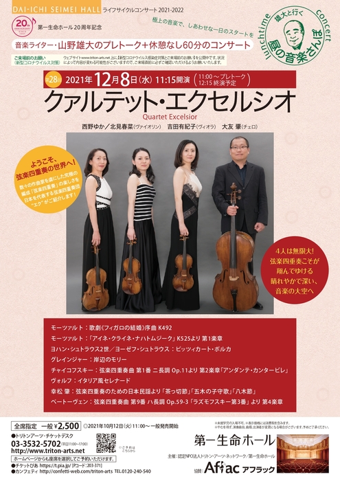 認定NPO法⼈トリトン・アーツ・ネットワーク(東京都中央区、理事⻑:⻑浜⼒雄)主催による、第一生命ホール20周年記念〈ライフサイクルコンサート〉『雄大と行く 昼の音楽さんぽ「第28回 クァルテット・エクセルシオ(弦楽四重奏)」』が2021年12月8日 (水)に第⼀⽣命ホール(東京都中央区)にて上演されます。チケットはカンフェティ(運営:ロングランプランニング株式会社、東京都新宿区、代表取締役:榑松 ⼤剛)、主催者チケットデスクほかにて10⽉12⽇(⽕)より発売開始いたしました。