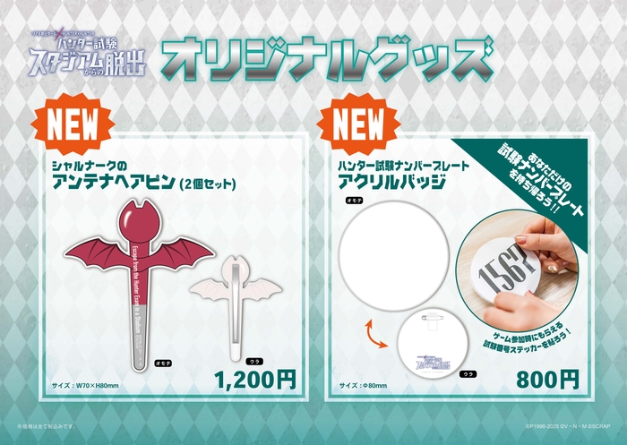 会場では全12種のオリジナルグッズを販売。リアル脱出ゲーム本編にも登場するキャラクター「シャルナーク」の念能力「携帯する他人の運命(ブラックボイス)」をモチーフにした「シャルナークのアンテナヘアピン」や、アニメでもお馴染みのハンター試験のナンバープレートを再現した「ハンター試験ナンバープレートアクリルバッジ」など、ユニークな商品を多数ラインナップされています。