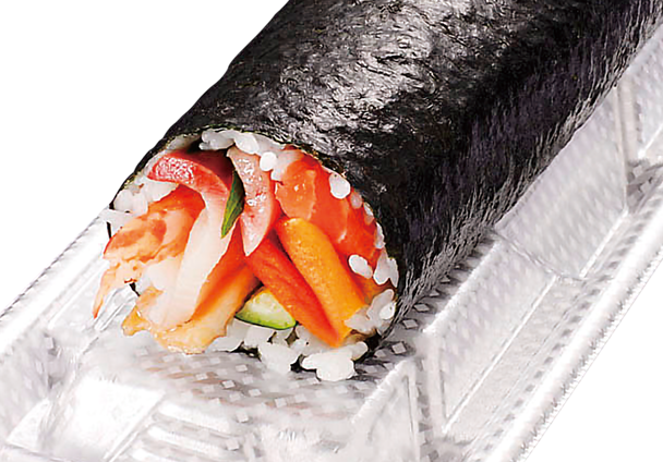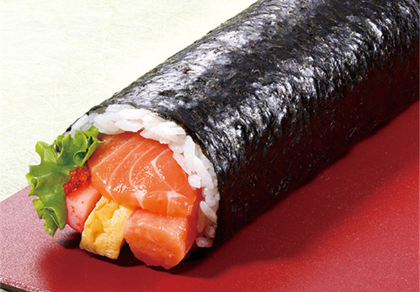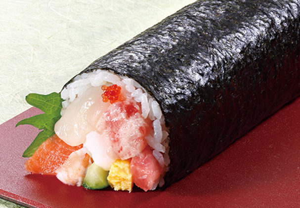 機能性表示食品であるライフオリジナルの“伊勢黒潮まだい”や生サーモンなどをふんだんに使用した贅沢な海鮮太巻。