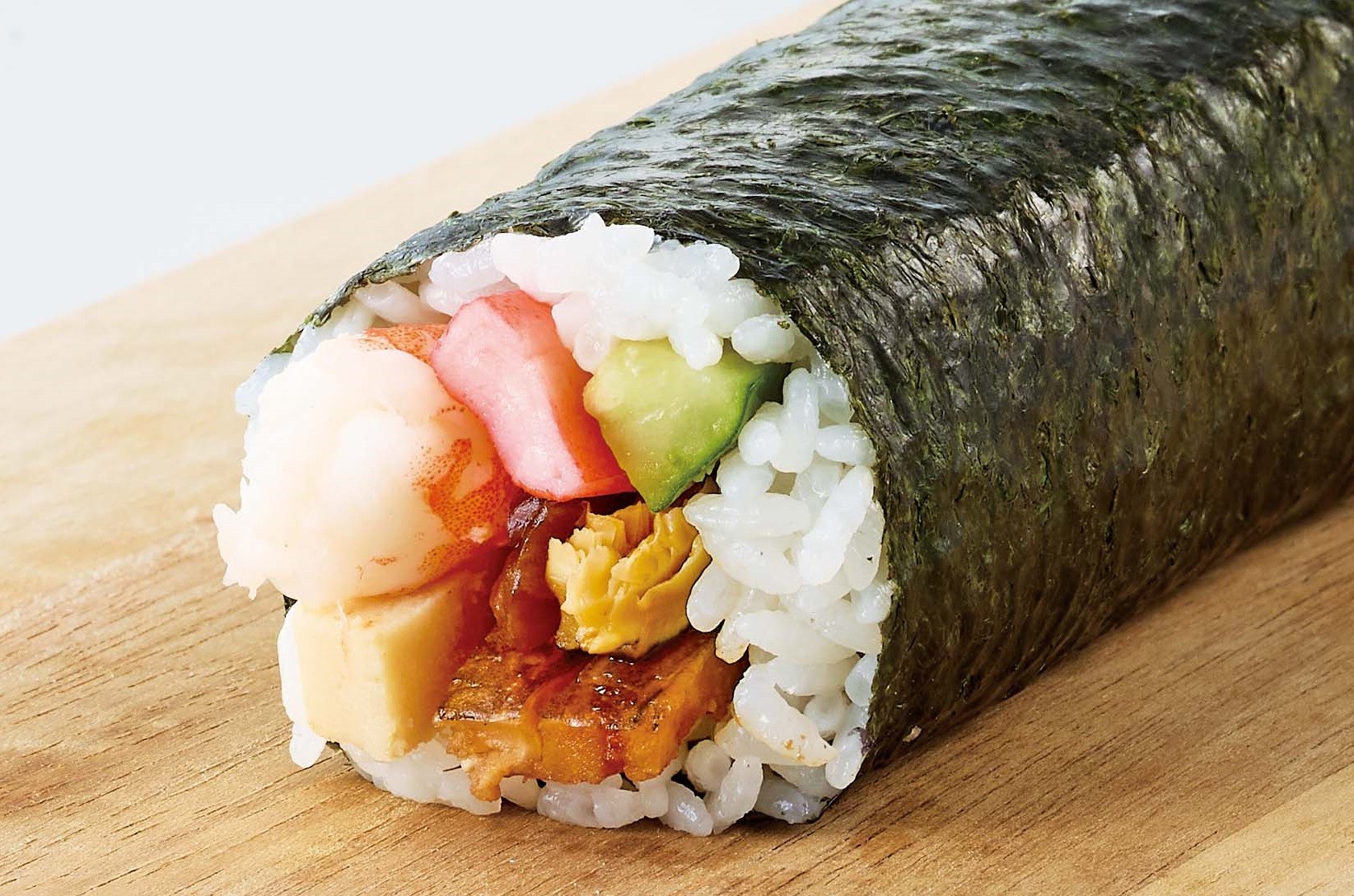 凍結していない魚のすり身が入った甘めの厚焼き玉子をふんだんに使用し、『七福』にちなみ『7種』の具材で巻きました。
