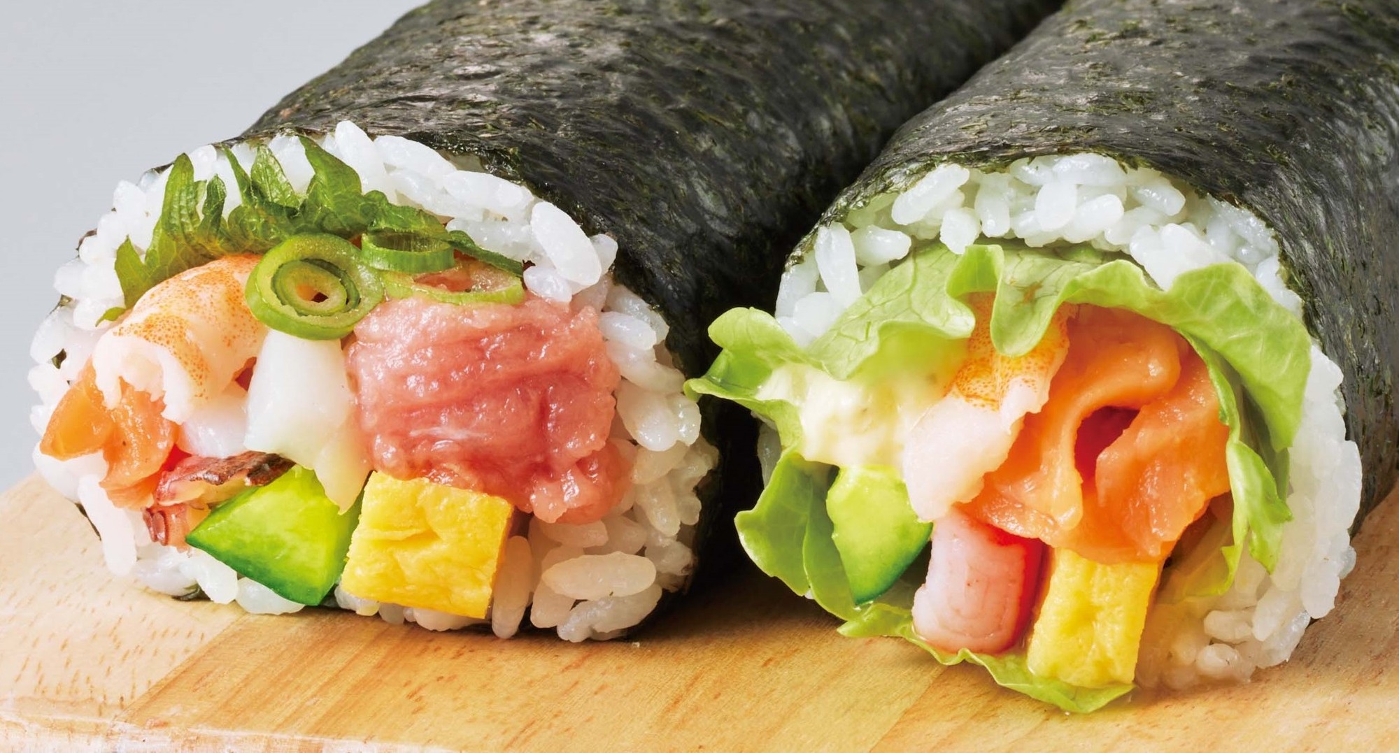 いろいろな種類を楽しみたいという方はこちら!北海道産帆立入り海鮮太巻・まぐろたっぷり太巻・生サーモン入りサラダ太巻のハーフが入ったセット。
