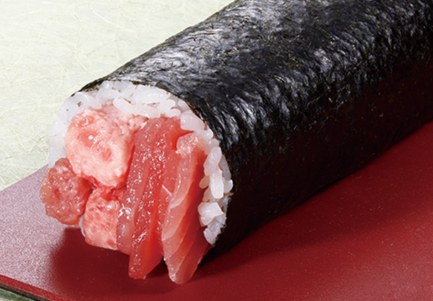 本鮪とろ・たたきまぐろ・きゅうり・大葉などが入ったまぐろづくしな太巻。