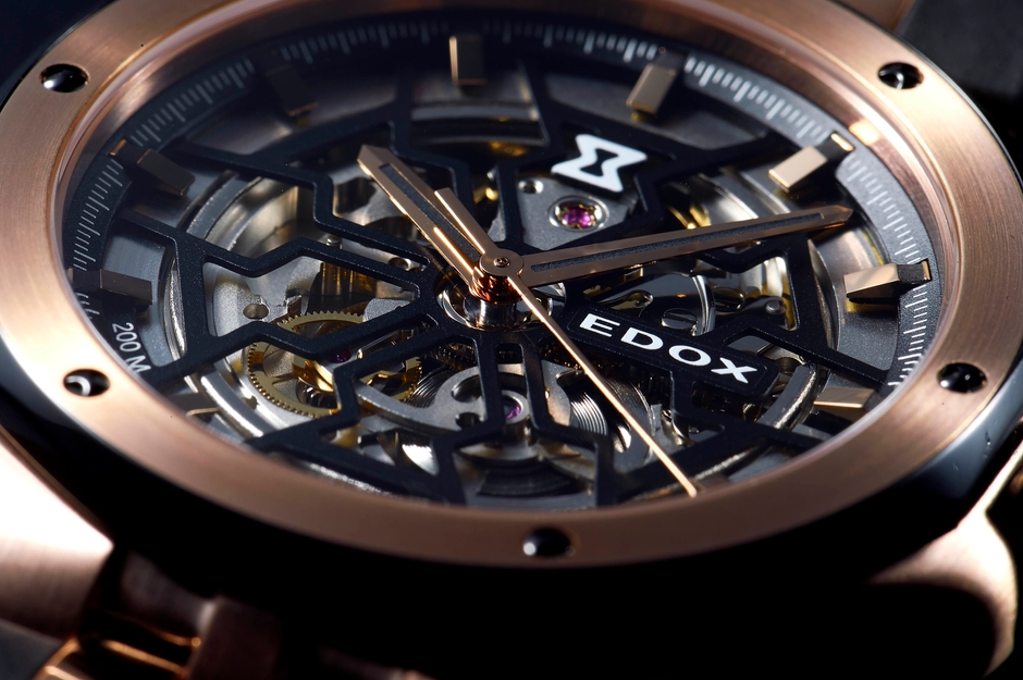 自動巻き、キャリバーEDOX853/約42時間パワーリザーブ/防水200m/316Lステンレススティール ケース(ピンクゴールドPVD)/スケルトンダイアル/ケース径43mm/ブラックラバーストラップ