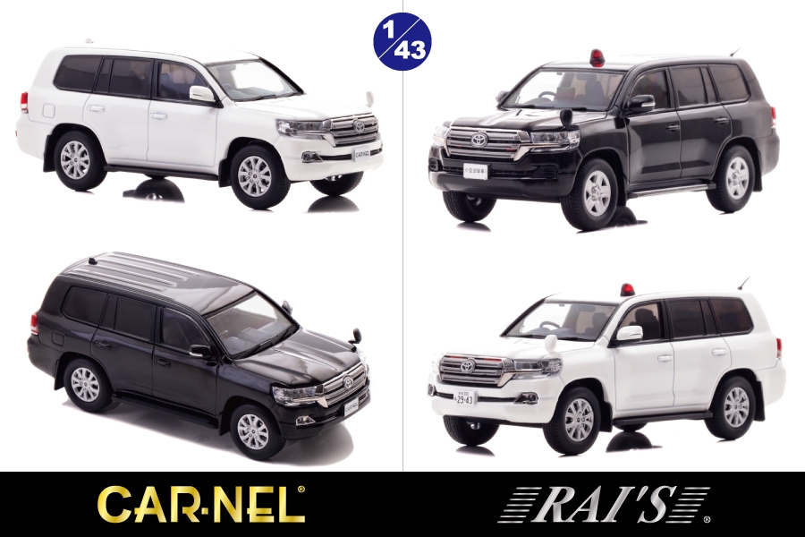 ランドクルーザー200系後期型を精密モデル化。市販車と警察の 機動隊遊撃車や暴走族対策車がラインナップ。数量限定品