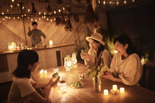 「グリーンハウス」では、年間で約50種類のハーブが育っています。通常は、日中のみ入場できる空間ですが、この期間限定で、涼しくなる夕方から夜にかけてバー空間がオープンします。オープンする時間には夕日が差し込み、夜はイルミネーションが輝く幻想的な雰囲気に変わります。建物の側面が一部開閉するため、夕方の涼しい外気を取り入れた空間で、野菜やハーブを使用したドリンクを片手に、リフレッシュすることができます。