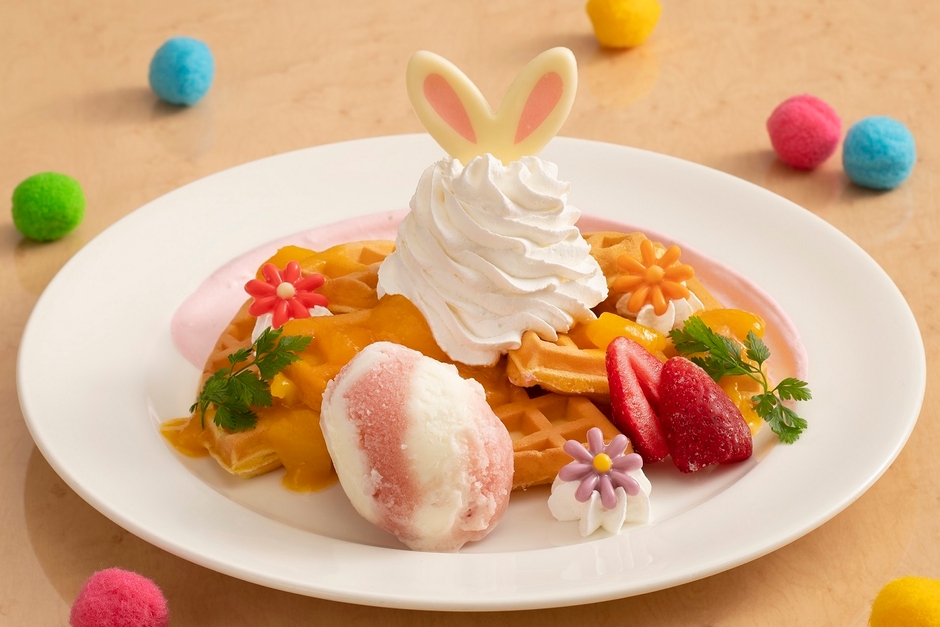 イースターの象徴であるうさぎや卵をモチーフにしたカラフルでかわいいメニューが登場します。ふんわりしたワッフルに、うさぎに見立てたクリームや卵形のアイスをあしらった「ハッピーイースターワッフルプレート」のほか、イースターエッグをモチーフにしたオムライスやハンバーグなどをお楽しみいただけます。
