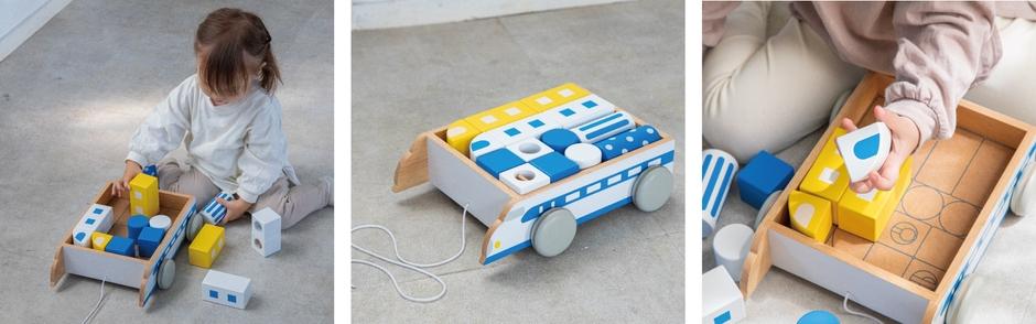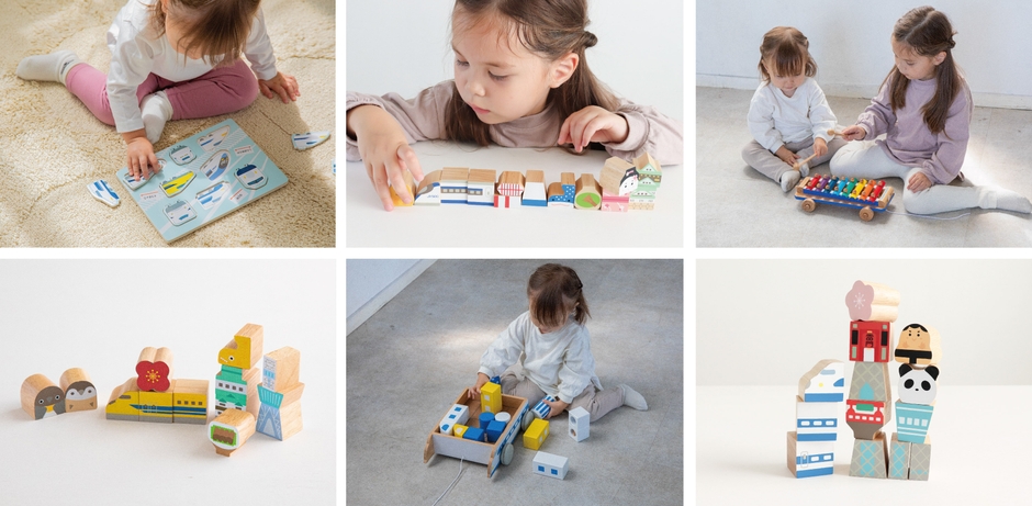 音が鳴るデザインつみきセット、木琴としてもあそぶことができるシロフォンカー、4種のご当地ブロック、型はめパズル、の全7種類の知育玩具は、「触る」「はめる」「音を鳴らす」「引っ張る」「組み立てる」等、五感をつかうあそびを通して、感受性や想像力、思考力、コミュニケーション力を養うことができます。手指や思考の発達に見合った遊び方のデザインや、子どもの好奇心を惹きつける色づかいも特徴です。