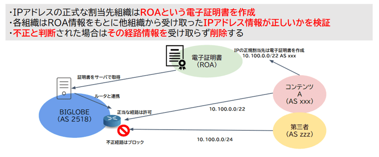 RPKIとは、IPアドレスの正当な使用権限があることを証明する「ROA(Route Origin Authorization)」を参照することで、不正な通信をブロックすることができる仕組みです。不正経路情報を用いた偽サイトへの誘導やアクセス遮断などは過去に数多く報告されており、本仕組みを用いてそのような不正利用を防ぐことが可能となります。RPKIの導入は、総務省のサイバーセキュリティタスクフォース内でも議論され、ガイドラインが提示されています。