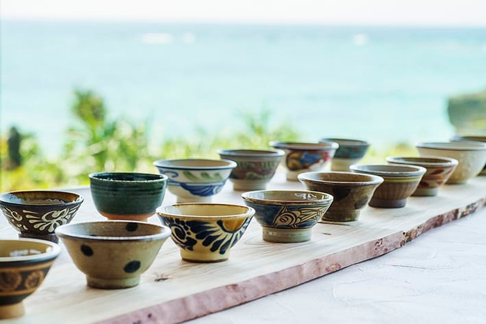読谷村内にある70以上の工房から様々なやちむんを揃えて、敷地内の各所に展示します。カフェでの時間を過ごしながら、さまざまな工房が手掛けるやちむんの個性を知ることができる、海辺の自然を活かしたユニークな展示です。
