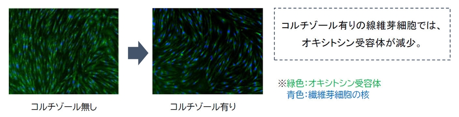 「コルチゾール」及び「コルチゾール再活性化酵素」による「オキシトシン受容体」抑制作用を調べました。その結果、「コルチゾール」及び「コルチゾール再活性化酵素」によって「オキシトシン受容体」が減少し、「オキシトシン」の作用を抑制することが分かりました。これにより、「コルチゾール」が多いと「オキシトシン」の作用が抑えられ、老化を促進するはたらきがあることを明らかにしました。