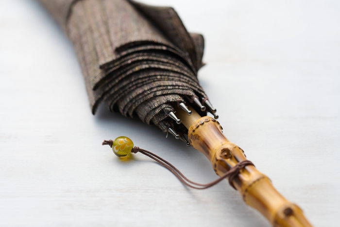 素材の特性上、節が多く絡まりやすい麻糸を、丁寧にほぐしながら一日中織機につきっきりで作業をします。それでも一日に織ることのできるのはたったの7~8メートル。手間暇かけて織り上げた平織りの生地は、適度なシャリ感があり清涼感のある触感が魅力です。傘を差すと日差しを木漏れ日のようにやわらかくなり、平織りの織り目から風が通り抜ける気持ちよさを実感していただけます。